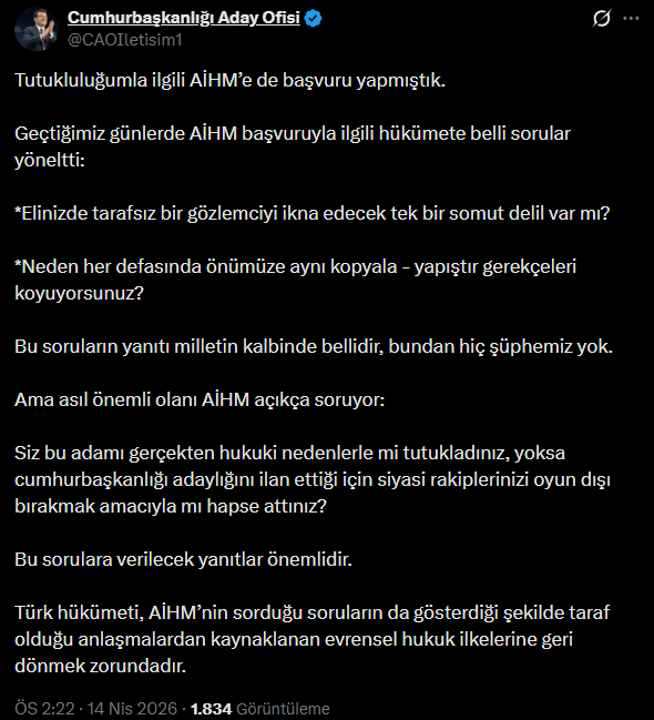 “Cumhurbaşkanlığı Aday Ofisi” hesabından iletisi paylaşılan İmamoğlu, “Türk hükümeti, AİHM’nin sorduğu soruların da gösterdiği formda taraf olduğu mutabakatlardan kaynaklanan üniversal hukuk unsurlarına geri dönmek zorundadır” dedi.