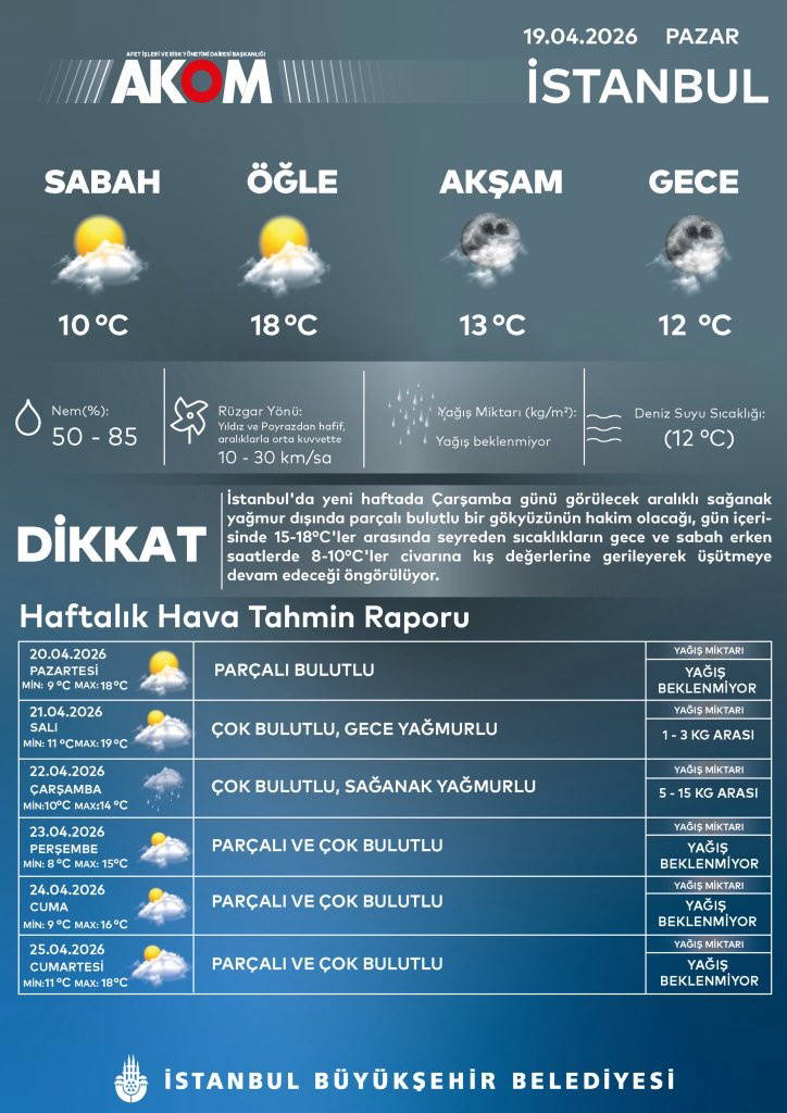 AKOM’un paylaştığı hava durumu notuna nazaran; yeni haftada Çarşamba günü görülecek aralıklı sağanak yağmur dışında kentte çoklukla kesimli bulutlu bir gökyüzü hakim olacak.