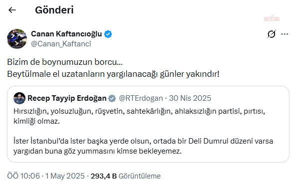 Hakkında daha evvel siyasi yasak kararı da verilen evvelki CHP İstanbul İl Başkanı Canan Kaftancıoğlu da bu paylaşımı alıntılayarak “Bizim de boynumuzun borcu… Beytülmale el uzatanların yargılanacağı günler yakındır” tabirlerini kullanmıştı.